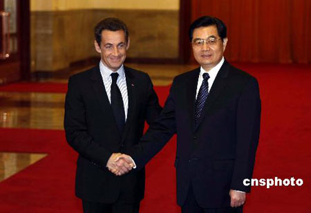 胡锦涛在北京人民大会堂举行仪式欢迎来访的法国总统萨科齐。中新社发 盛佳鹏 摄