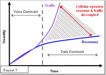 图2是电信分析机构HeavyReading于2007年5月发布的数据,数据显示,当我们进入移动多媒体和数据业务时代时,营业收入(Revenue)和时间(Time)的线性关系夹角迅速减小。运营商能以更低的成本提供品质更高的服务,但是市场的主要基调却是:“我们只在等待价格的回落。”