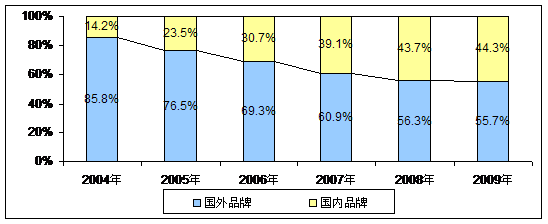 图2 2004-2009年中国GNSS产品国内外品牌市场销售额结构变化