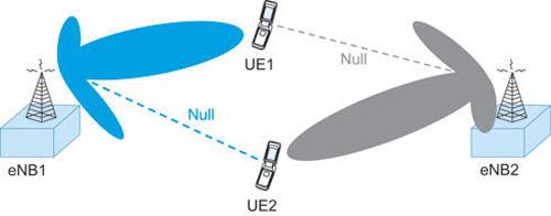 * 主瓣至旁瓣的电平:预期主瓣发射功率相对于多余旁瓣发射功率的选择性功率差。 在现代无线蜂窝通信系统中,一个最大的挑战是蜂窝小区边缘性能。这是波束赋形技术在提供 LTE 业务方面能够发挥关键作用的主要原因。图3显示了两个实际的情景示例,它们均利用了波束赋形的先进特性以改善现代蜂窝无线通信系统中的性能。 图3(a)为两个相邻的蜂窝小区,每个蜂窝小区都与位于两个蜂窝小区之间边界上的单独用户设备进行通信。此图显示,eNB1正在与目标设备UE1通 信,eNB1发射使用波束赋形来最大限度提高 UE1方位方向中的信号功率。同时,我们还可看到,eNB1正尝试通过控制UE2方向中的功率零点位置,最大限度地减少对UE2的干扰。同样,eNB2正 使用波束赋形最大限度提高其在UE2方向上的发射接收率,同时减少对UE1的干扰。在此情景中,使用波束赋形显然能够为蜂窝小区边缘用户提供非常大的性能 改善。必要时,可以使用波束赋形增益来提高蜂窝小区覆盖率。