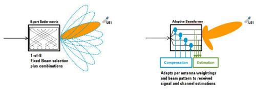 图3(b):用于使用 MU-MIMO 进行蜂窝小区容量改善的波束赋形 图3(b)描述了与两个空间分离的设备(UE3和UE4)同时进行的单小区(eNB3)通信。由于可以独立地对每个空间多路复用传输层应用不同的波束赋 形加权值,所以可以结合使用空分多址(SDMA) 和 多用户MIMO(MU-MIMO)传输,提供经过改善的小区容量。 图4显示了两种不同的波束赋形实施技术。图4(a)中的实例是固定传统开关波束赋形器,其中包括一个8端口Butler矩阵波形赋形网络。这个网络实施由不同的可选择固定时间或相位时延路径矩阵使用90°混合耦合器和相移器组合实施而成。 产生的固定发射波束数量等于用于构成 Butler 矩阵网络的天线阵元N的数量。(示例使用了8个天线,产生了8条可选择的波束。)这有时也称为“波束网格”的波束赋形网络,支持选择任何单独的或组合的N个固定发射波束,以便最大限度提高设备接收机的SINR。 在无线网络中,最佳的eNB下行链路发射波束选择主要取决于对蜂窝小区中UE位置的了解。这种了解实际上可通过测量eNB接收天线阵列上的上行链路信号到达角(AoA)直接获得,也可从上行链路控制信道质量反馈信息间接推导得出。