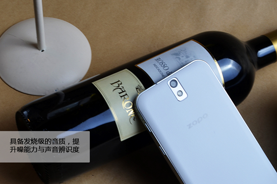 正面最中间的位置是产品名称“卓普小黑II”和产品定位“发烧级影音智能手机”的烫印字样,其中前者是蓝色,后者是银色。 左右两侧都是卓普中英混排的蓝色烫印Logo“ZOPO卓普”。底面是制造商和服务电话等备注信息。