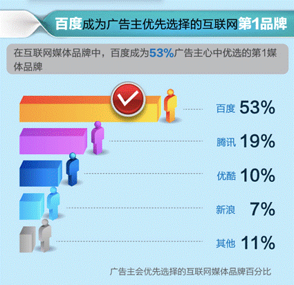 作为全球最大的中文搜索引擎,百度占有中国70%以上的市场份额,也是中国最大的媒体平台。在此次报告中,百度成为53%广告主优先选择的第一互联网媒体品牌。广告主的认可选择在百度广告收入上也可以得到印证。2013年前三季度其广告总营收为224.1亿元,全年预计将达300亿左右,领跑整个互联网广告市场,甚至超过央视。