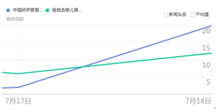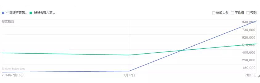 好声音的王者回归还引起了全民的搜索热情。百度指数显示,《中国好声音》第三季的搜索指数已经达到84万,超过《爸爸去哪儿》第二季。百度搜索结果数据显示,中国好声音的搜索量已经突破6240万。同时,作为现象级综艺节目,《好声音》的回归引发了媒体的关注热情。根据百度指数的新闻监测数据,目前《中国好声音》第三季媒体指数已经力压《爸爸去哪儿》第二季。