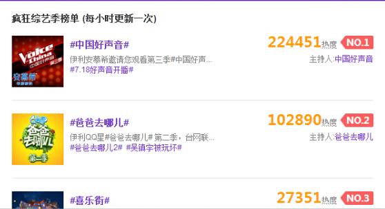 《中国好声音》第三季实现了中国视频网站综艺节目商业化上的最大破冰,伊利安慕希品牌投入8800万元获得第三季《中国好声音》网络总冠名,成为中国在线视频行业最大的内容冠名赞助。7月19日的淘宝指数显示,安慕希产品销售拉动明显,近30天的成交指数环比增长14%。
