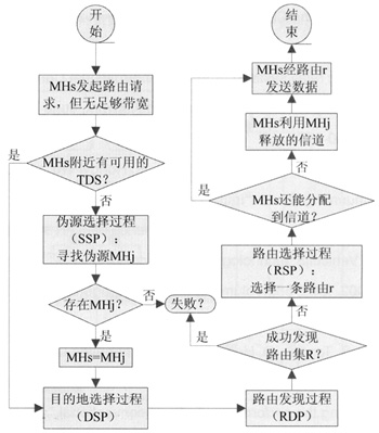 一旦选好了一个或多个目的地,路由发现过程RDP(RouteDiscoveryProcedure)就来寻找满足目的地小区带宽的路由。如果找到了多条路由,路由选择过程RSP(RouteSelection Procedure)就用来选择最合适的路由以转发MHs的数据。整个过程就如图6所示。