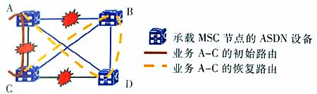 传统的网络使用环保护,只能保护单点断纤,ASON可运用于环结构,但如果使用Mesh网络结构,则可以充分发挥ASON抗多点失效的能力,在网络多条链路失效的情况下保护业务,实现“有路即通”,有效地提高了网络的安全性。如图4所示,即使存在3处断纤(A-B,A-C,C-D),对于A-C的业务仍然可以不中断。