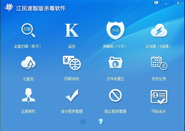 在强大的双引擎带动下,江民速智版杀毒软件可实现全盘断点续扫功能,不仅节约了扫描时间,对隐藏病毒能够彻底查杀。新增云鉴定网址功能,对可疑网址进行即时阻止,业内首创的网站名片功能更能有效防止进入钓鱼或冒名网站,为用户的个人财产和信息安全保驾护航。 [1] [2]
