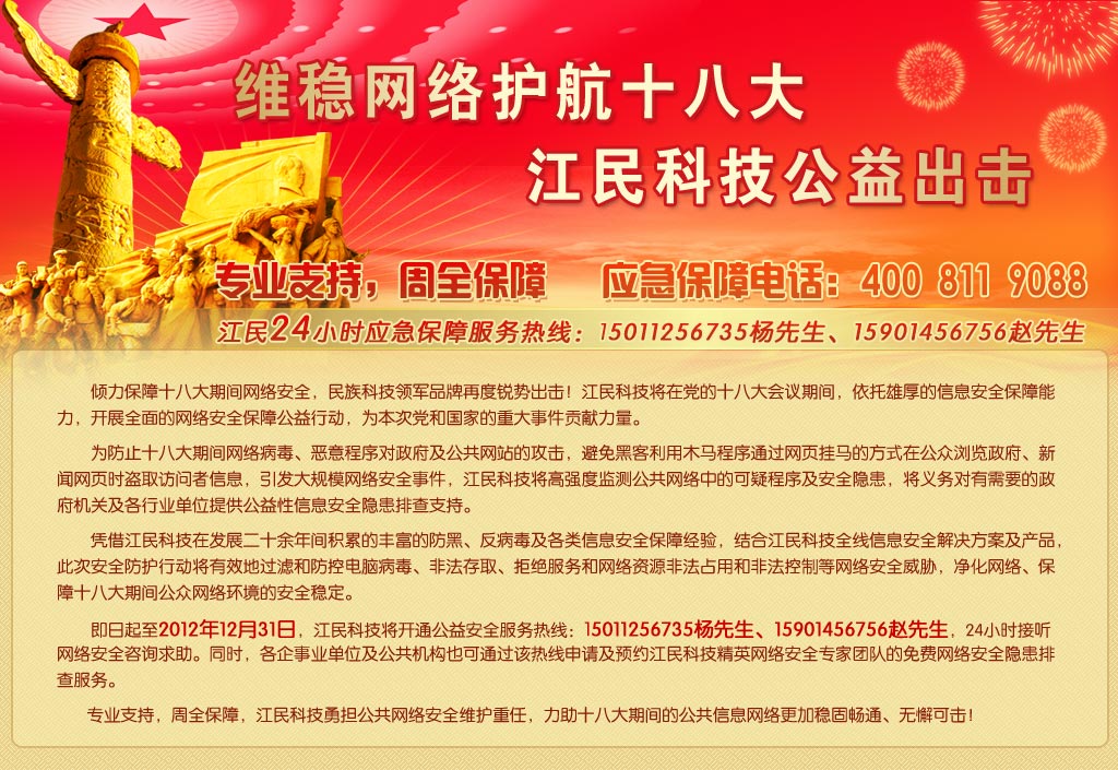 江民作为民族科技的领导者,始终以维护网络用户安全为己任。江民不仅在网络用户的安全维护上时刻提高警惕,在党和国家需要的时候也始终站在第一线,在十八大召开之际,为防止网络病毒、恶意程序对政府及公共网站的攻击,避免黑客利用木马程序通过网页挂马的方式盗取用户信息、引发大规模网络安全事件,江民科技将高强度监控公共网络中的可疑程序及安全隐患,将义务对有需要的政府机关及各行业单位提供公益性信息安全隐患排查,欢迎拨打应急保障电话:400-811-9088。 [1] [2]
